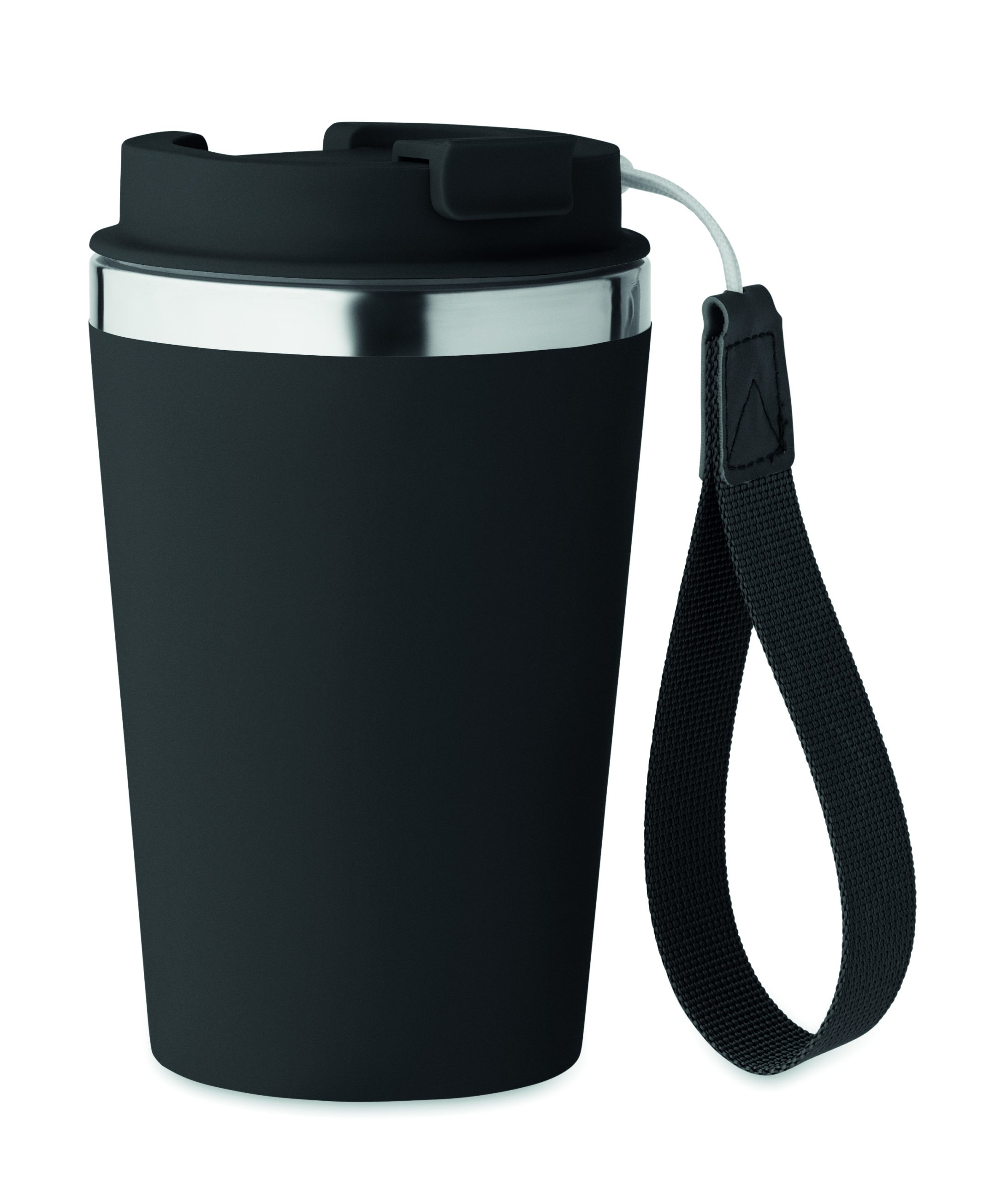 Double wall tumbler in recycled stainless steel (90% recycled stainless steel and 10% stainless steel) with PP outside layer with RPET wrist strap. Capacity: 350 ml.