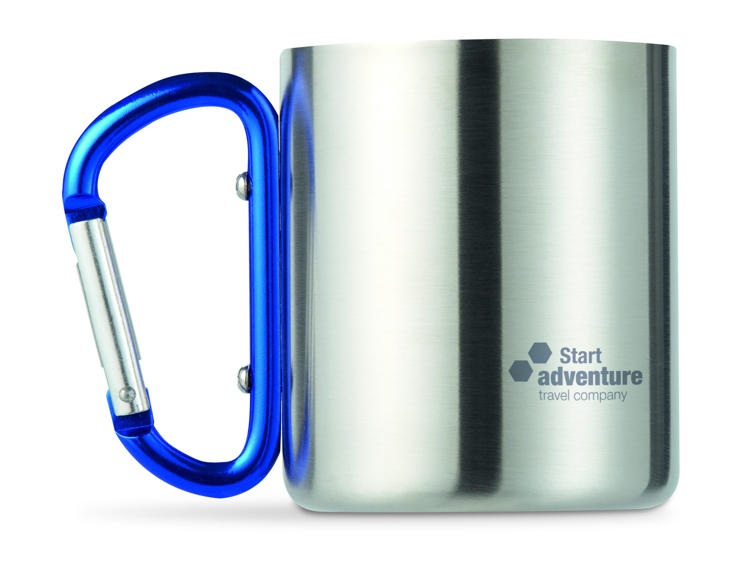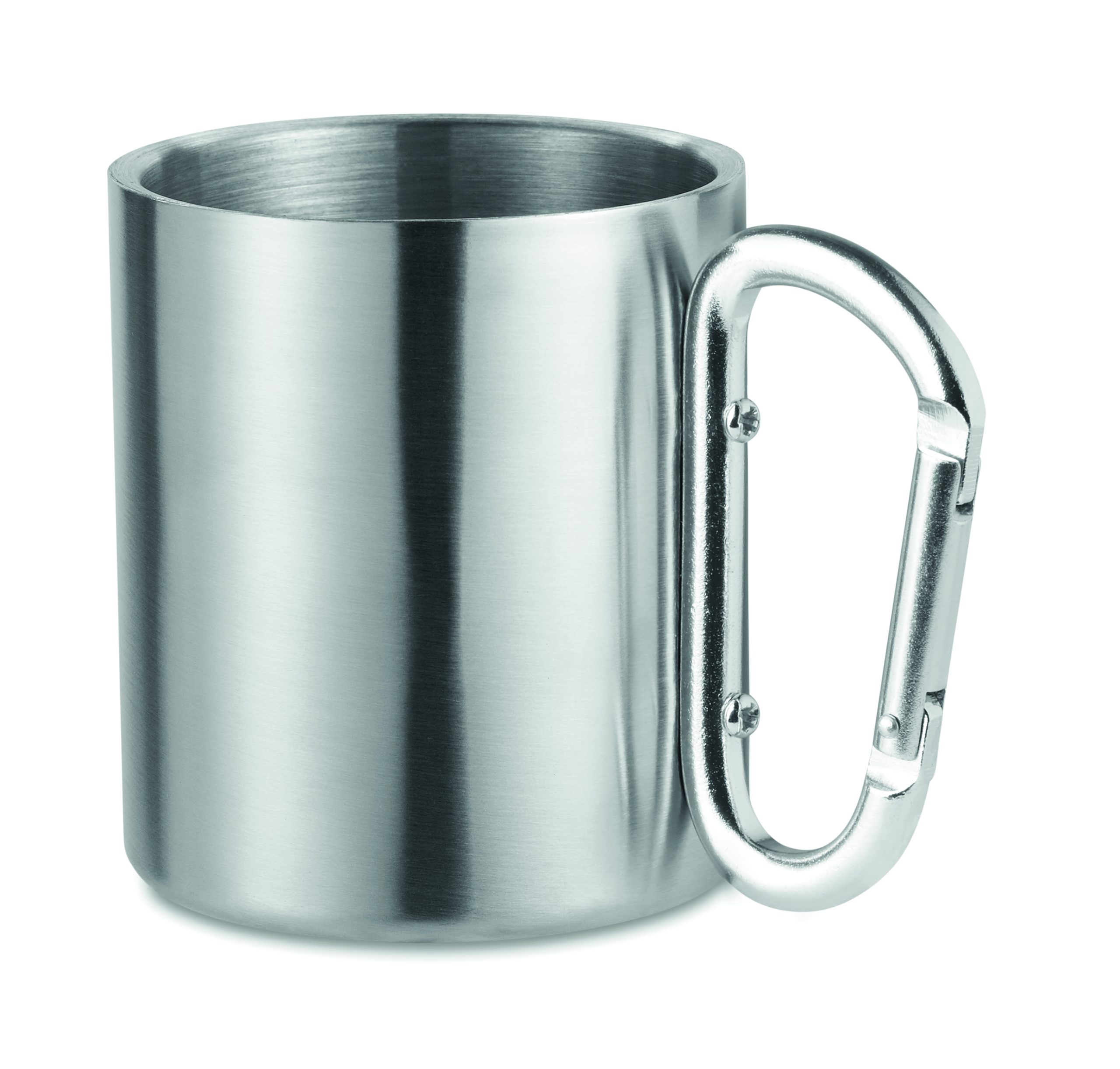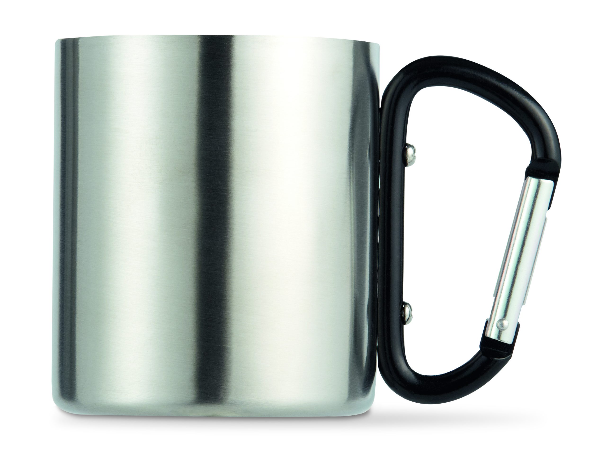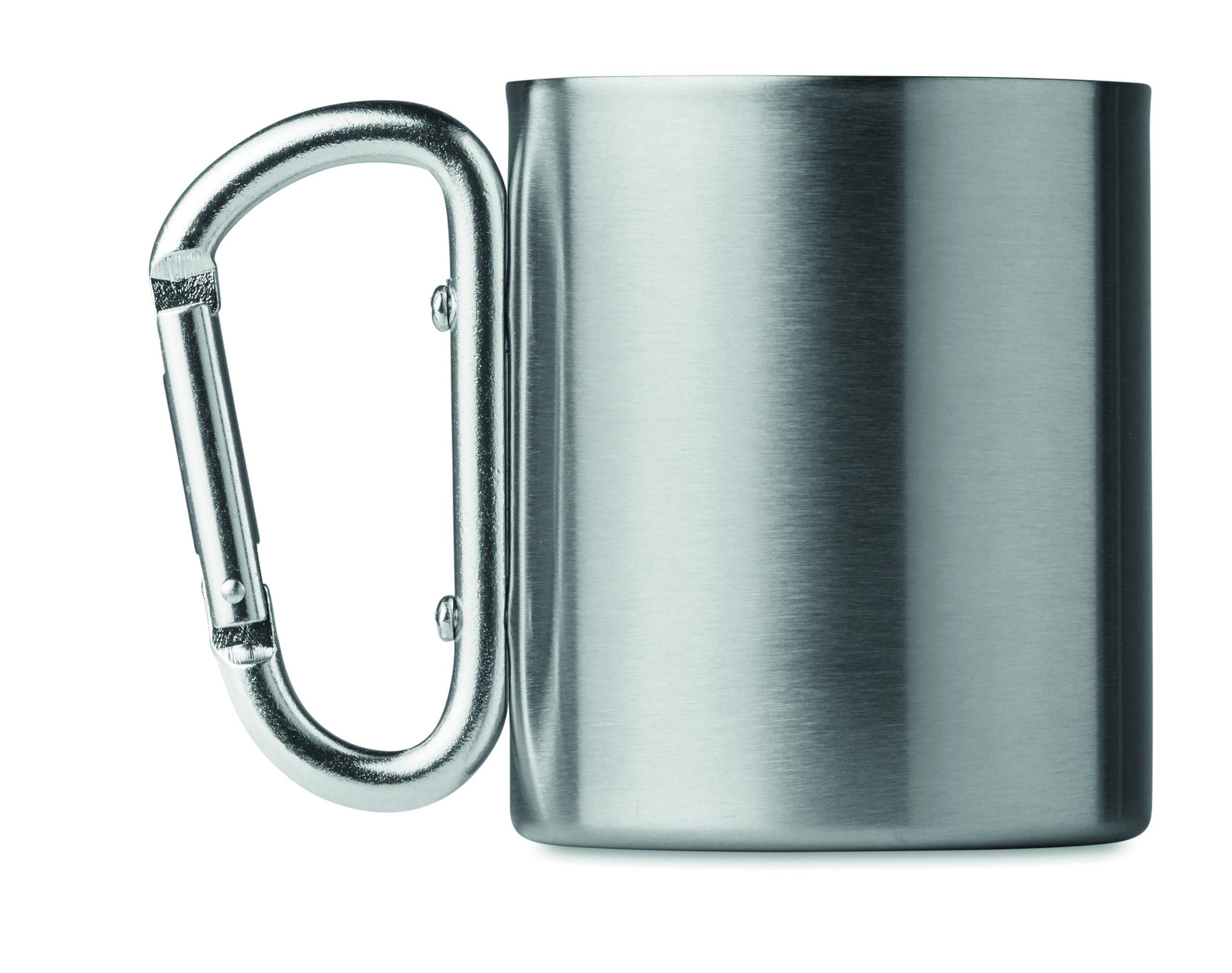 Double wall stainless steel mug, with carabiner handle. Capacity: 220 ml.