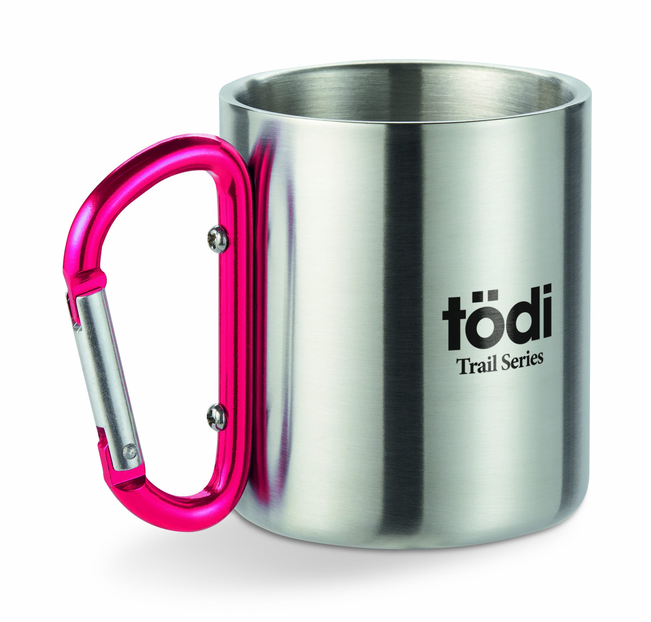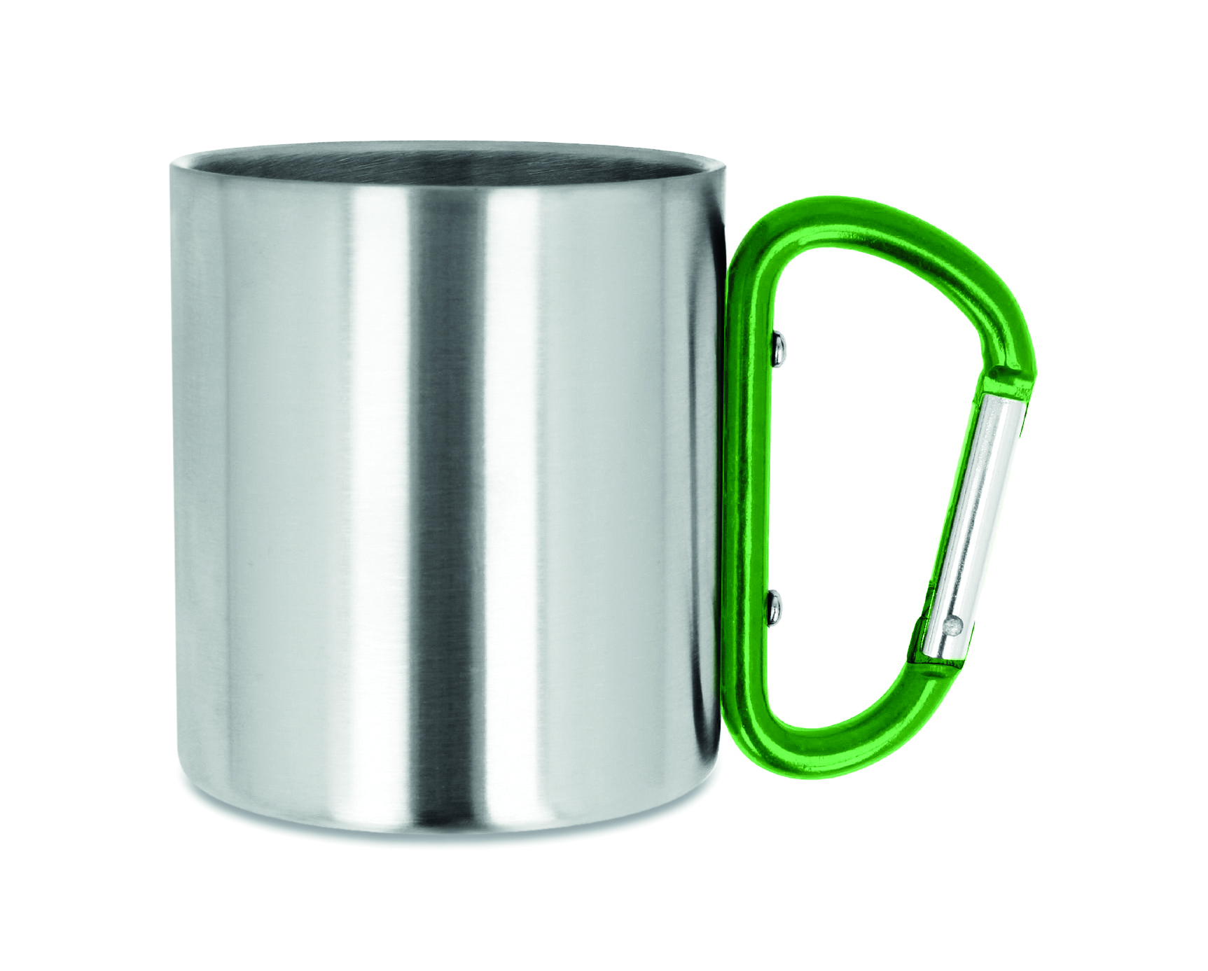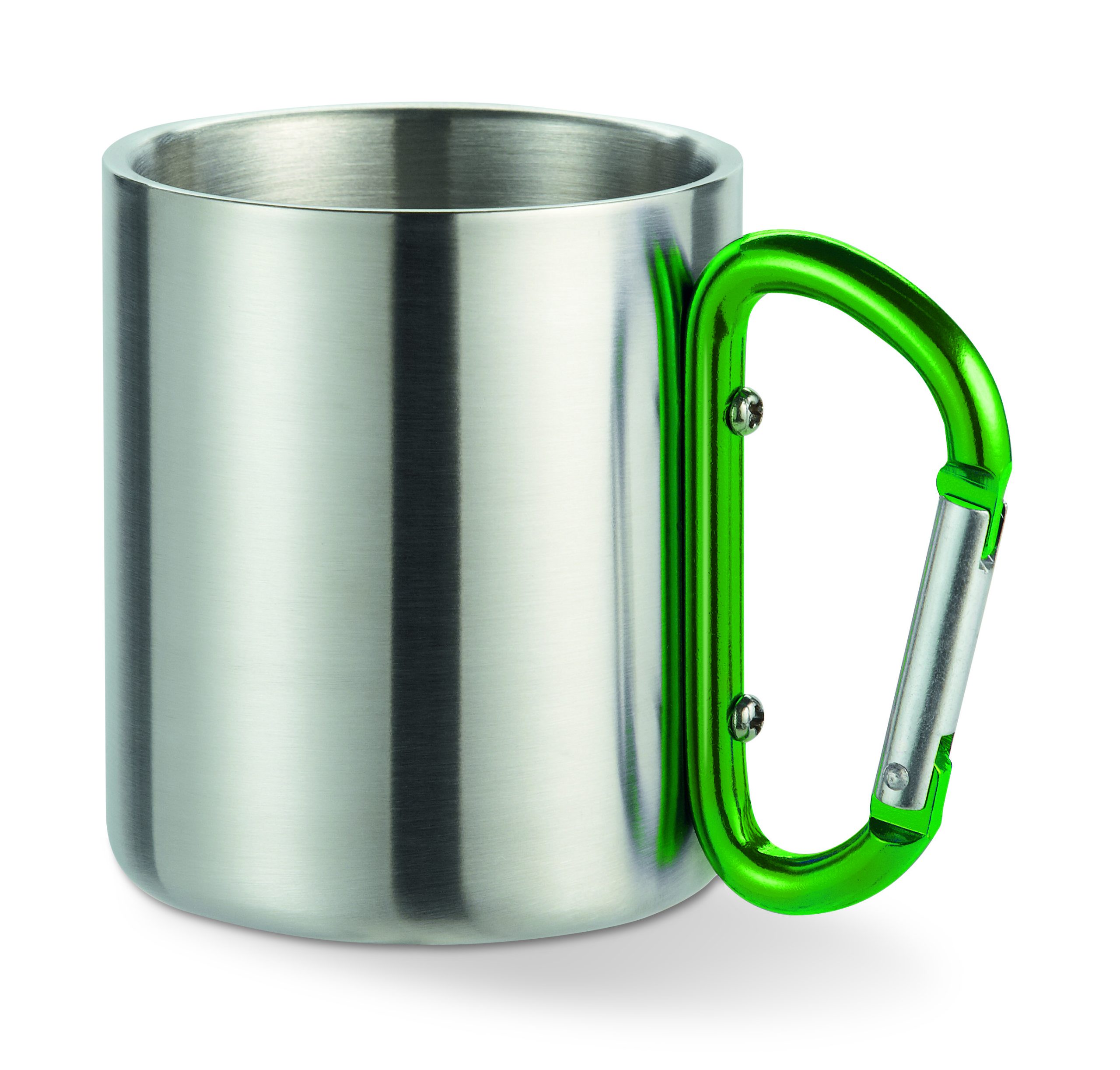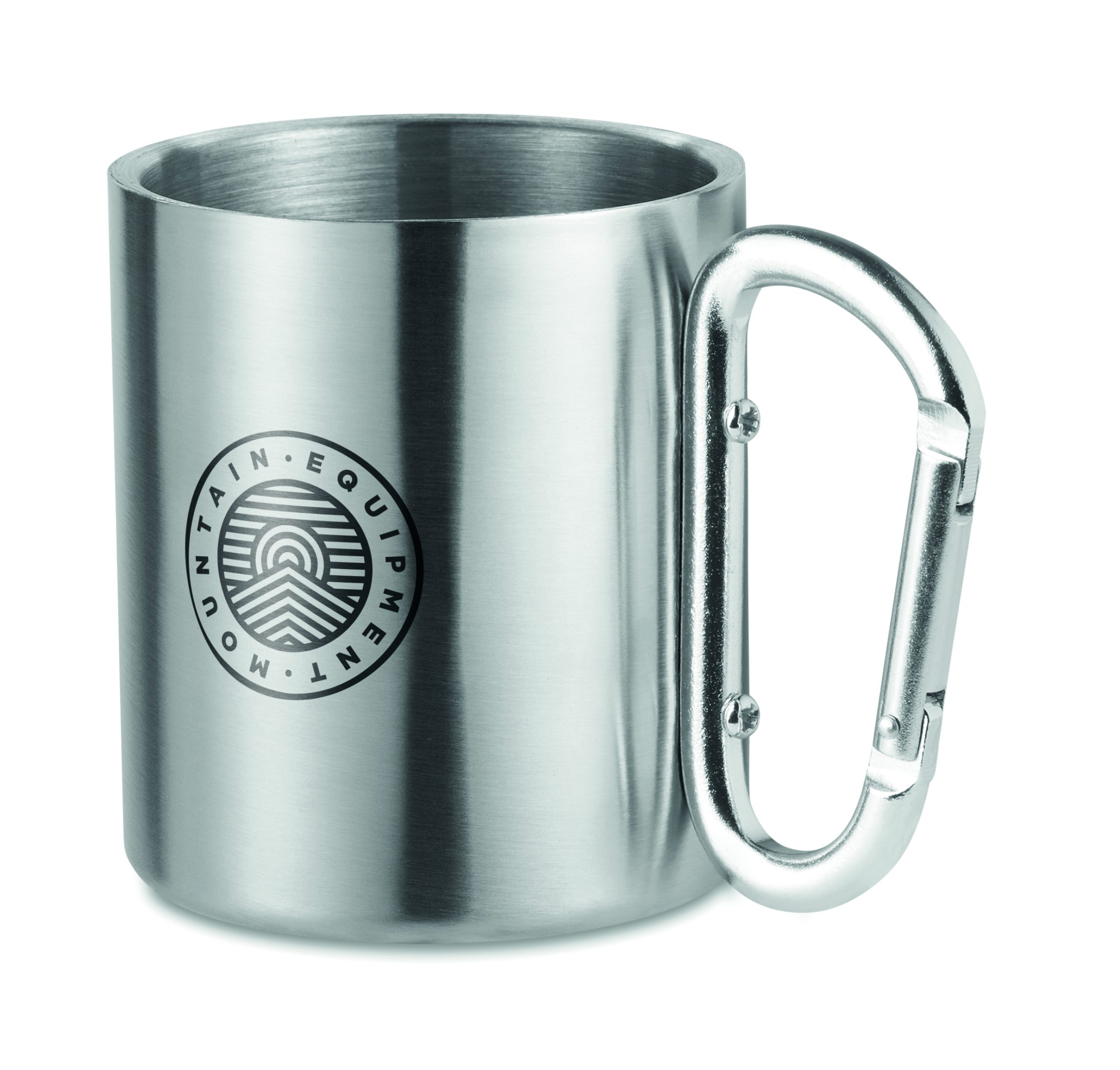 Double wall stainless steel mug, with carabiner handle. Capacity: 220 ml.