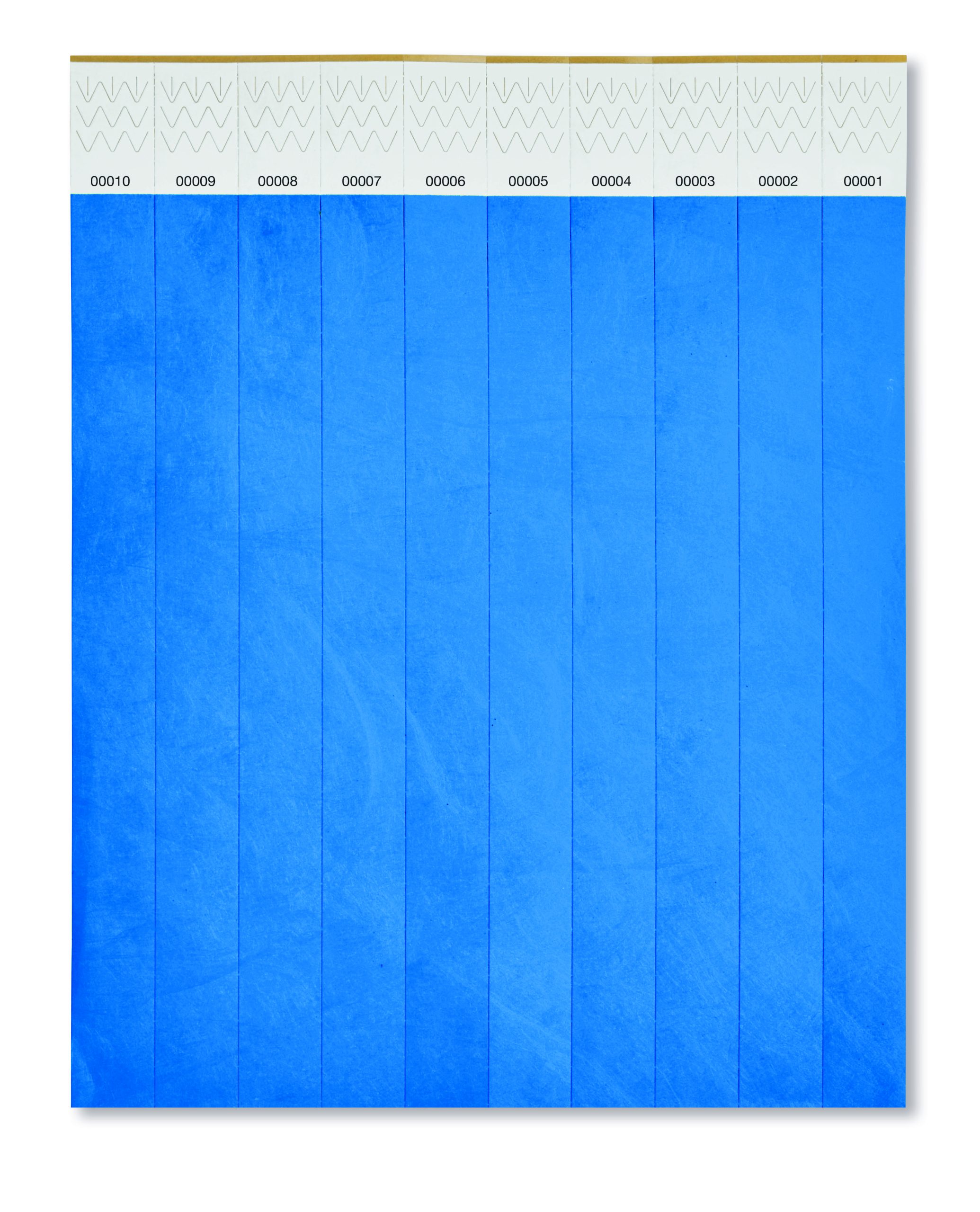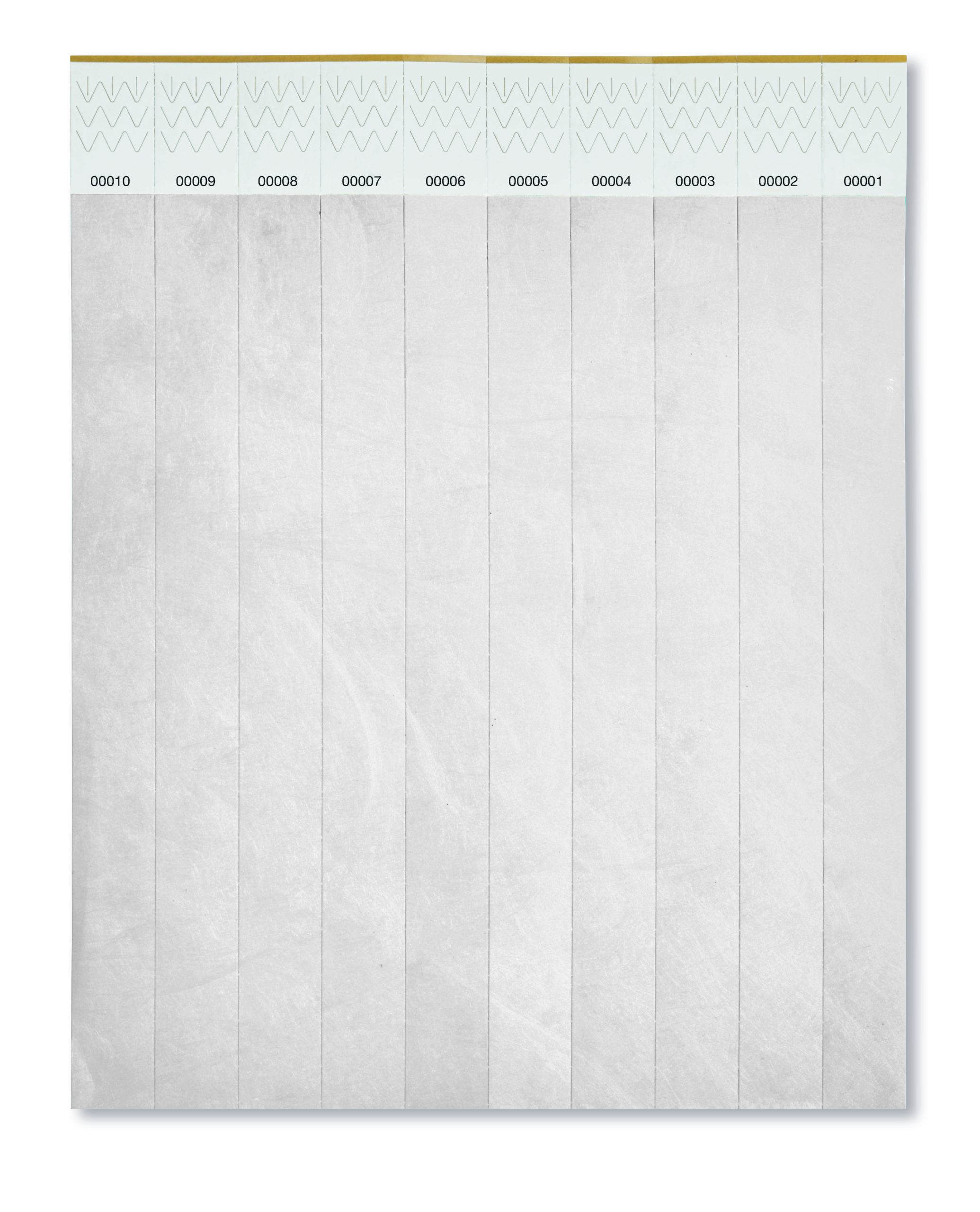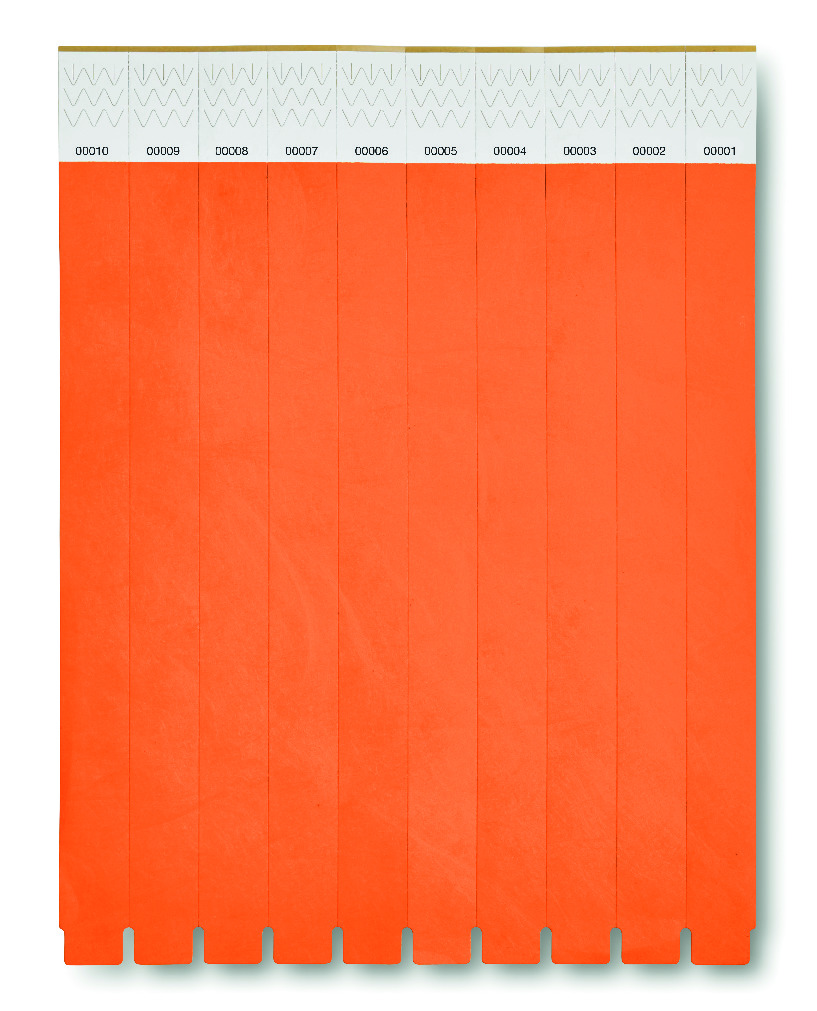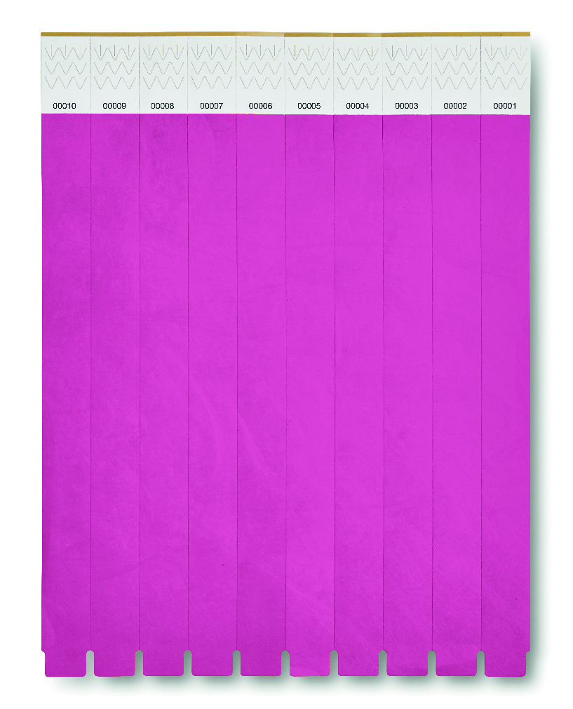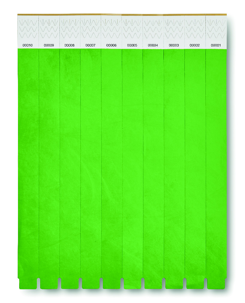 One sheet of 10 event wristbands. DuPont ™ Tyvek® 19mm wide. Including unique numbering on each wristband. Made in EU.