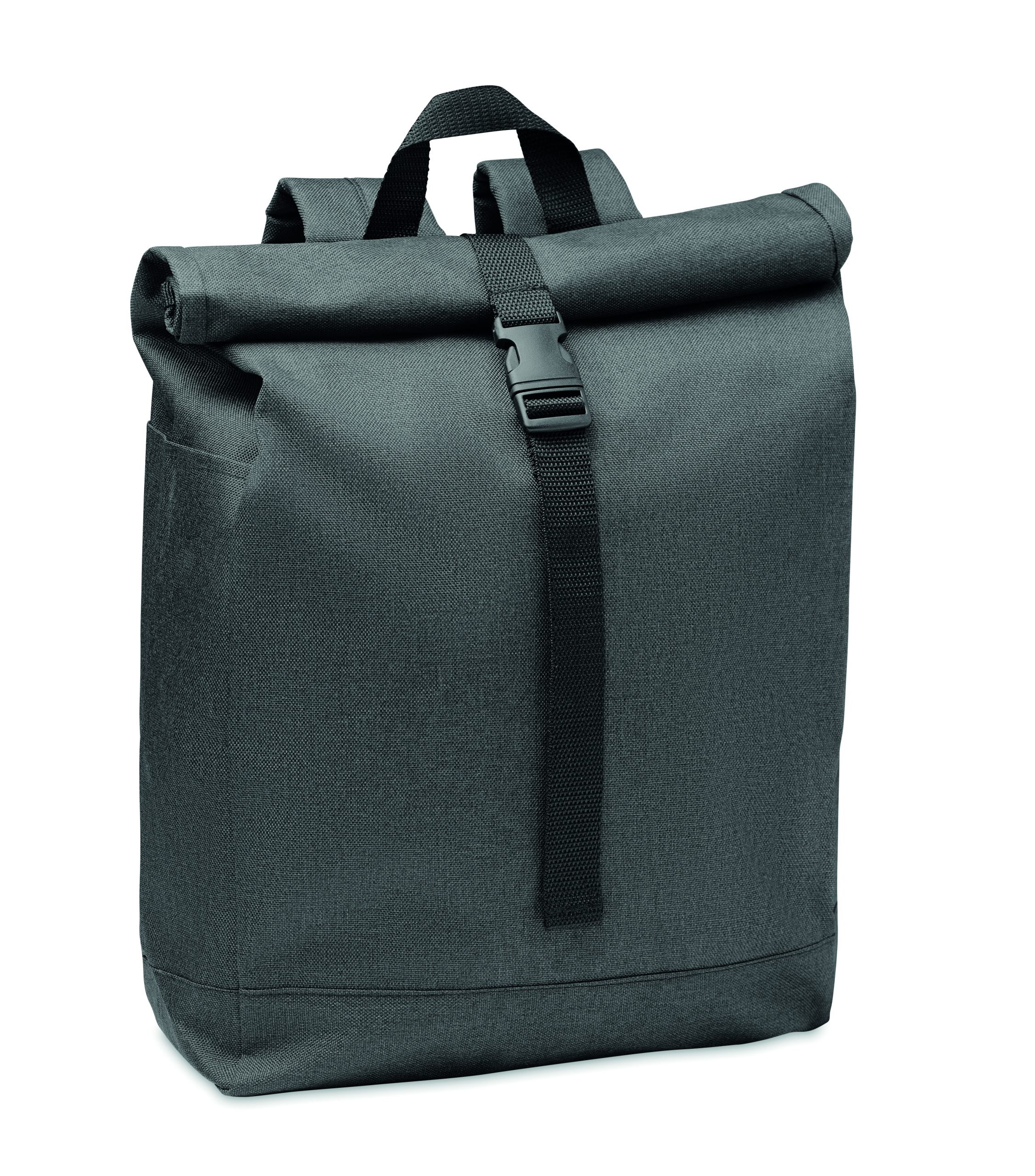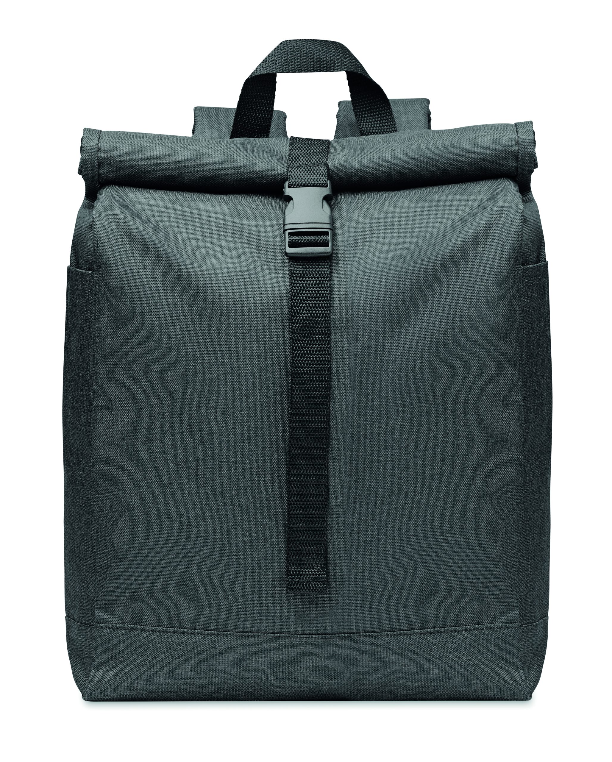 Backpack in 600D RPET 2 tone polyester with roll top closure.