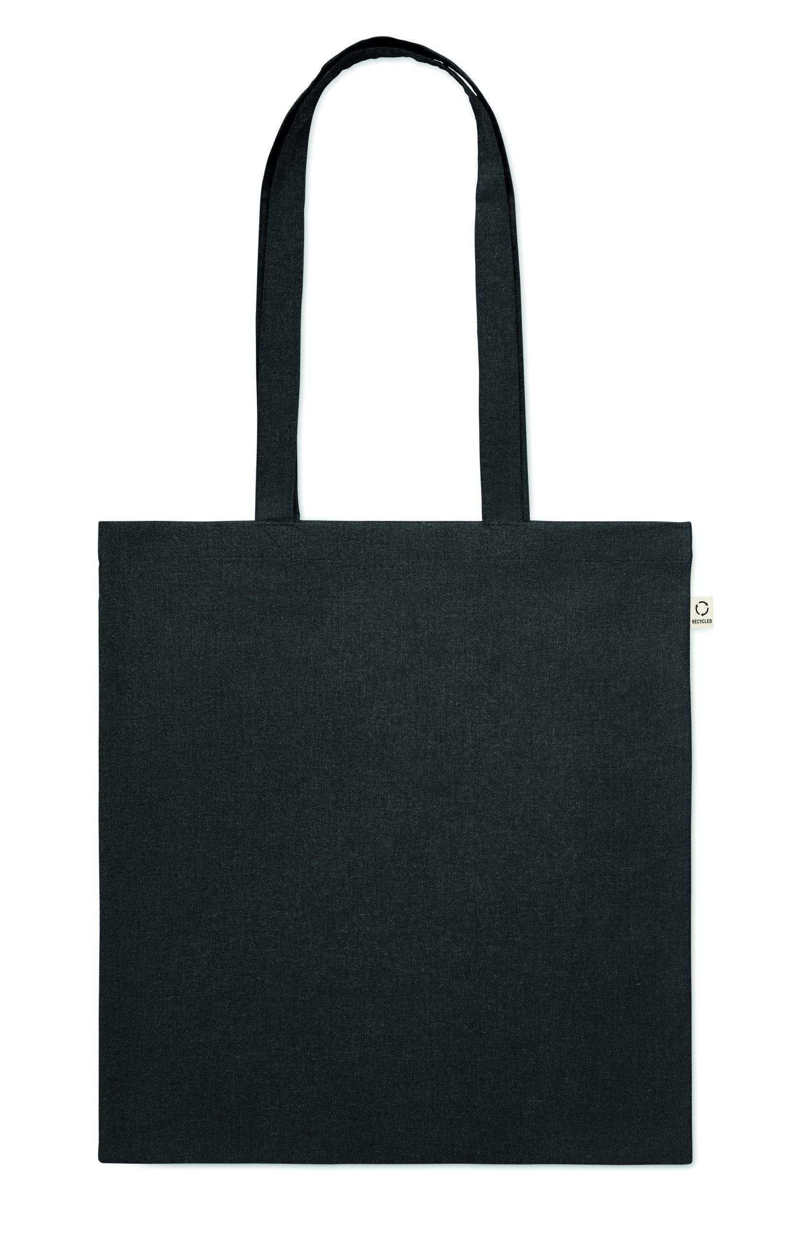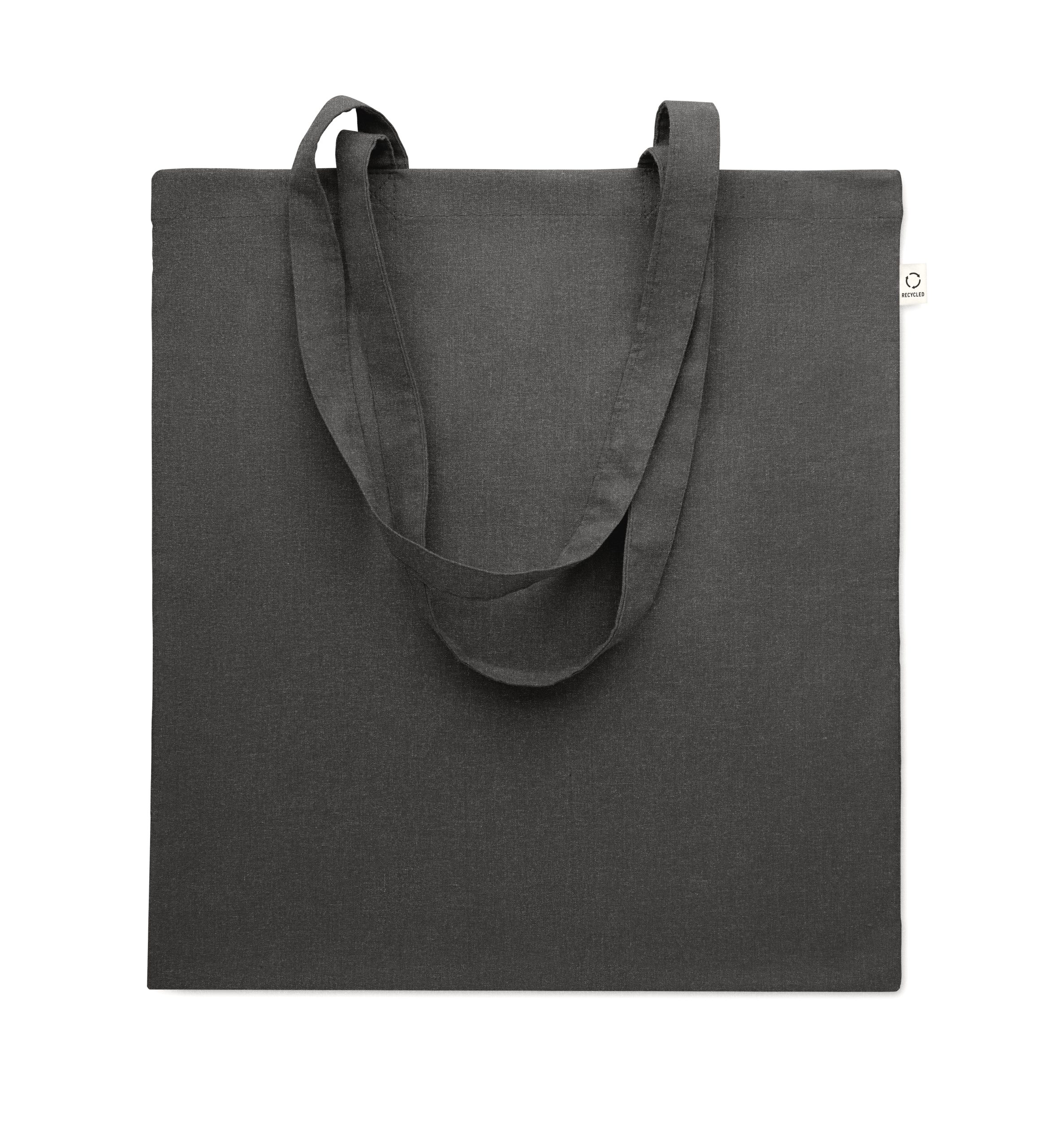 Recycled pre-consumer cotton shopping bag (70% recycled cotton and 30% RPET) with long handles. 140 gr/m². This item can shrink after printing.