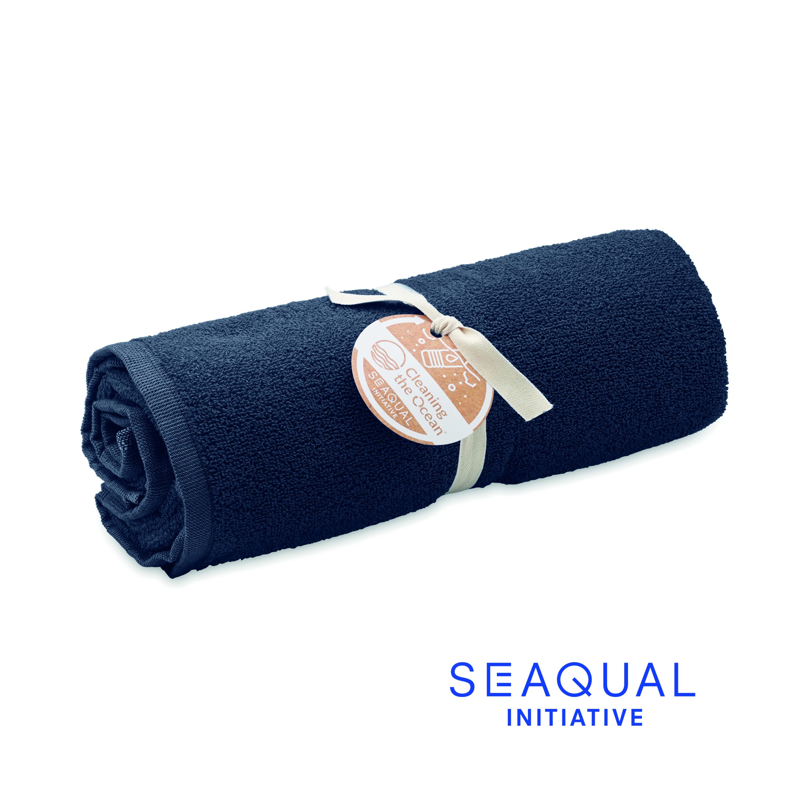 Recycled fabrics eco jacquard bath or beach towel. 70% recycled cotton and 30% ecycled polyester SEAQUAL® YARN. 500 gr/m². 100×170 cm. SEAQUAL INITIATIVE works with ocean clean-ups around the world to bring value to the waste that they recover. Made in EU.