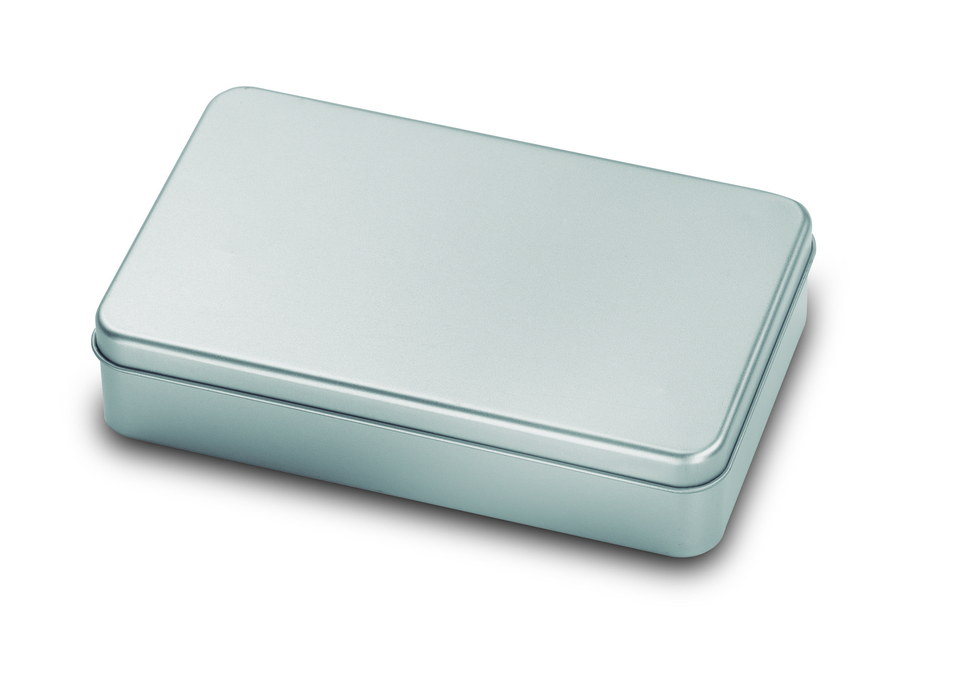 Wine set including bottle opener, stopper, pourer and anti-drip ring presented in tin box.