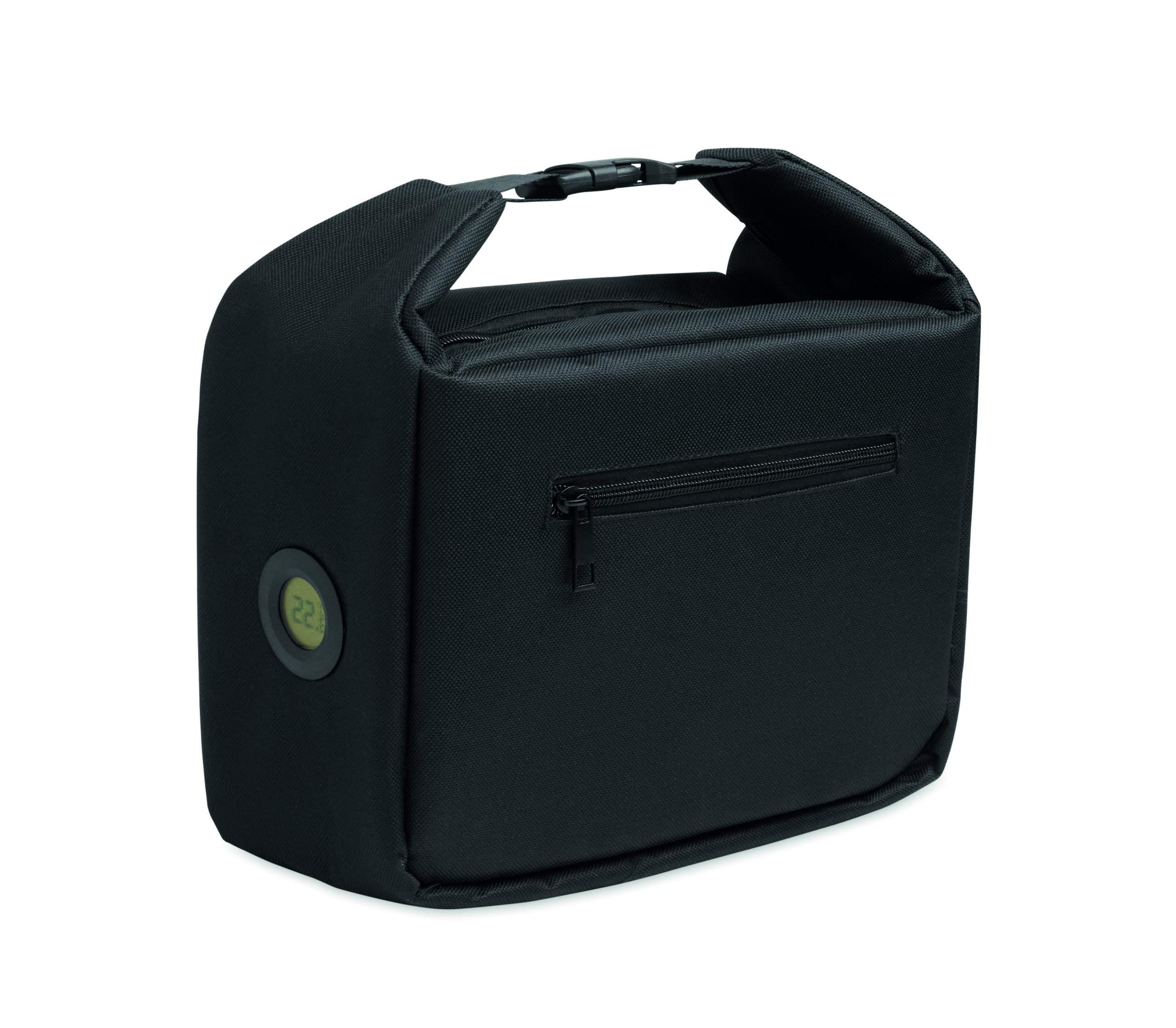 Cooler lunch bag with internal temperature indicator made of 600D RPET with 3mm PE foam with aluminium foil lining. Buckle closure. Zippered main compartment. With side zippered pocket. Capacity: 5 L