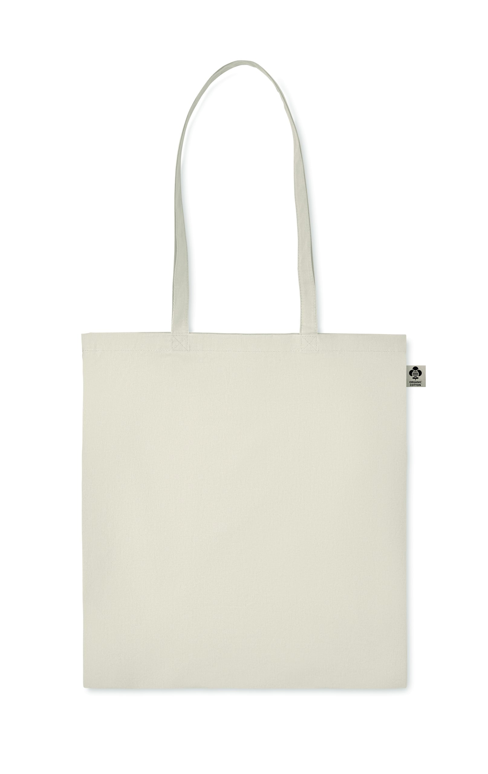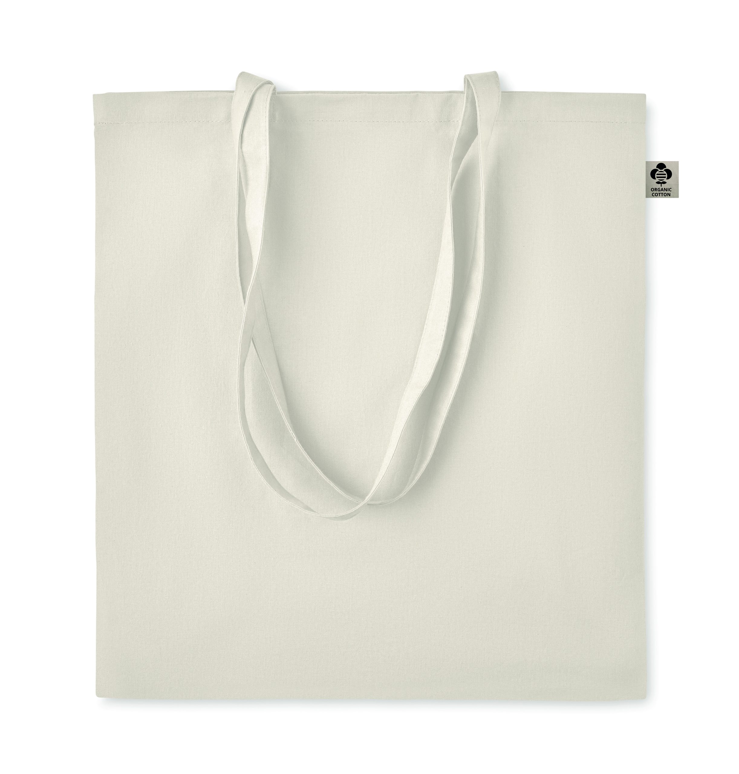 Organic cotton shopping bag with long handles. A classic tote bag design made to carry your daily groceries or other items. Carry the bag in your hands or over your shoulder with the long handles. Made from 100% natural organic cotton 140 gr/m².